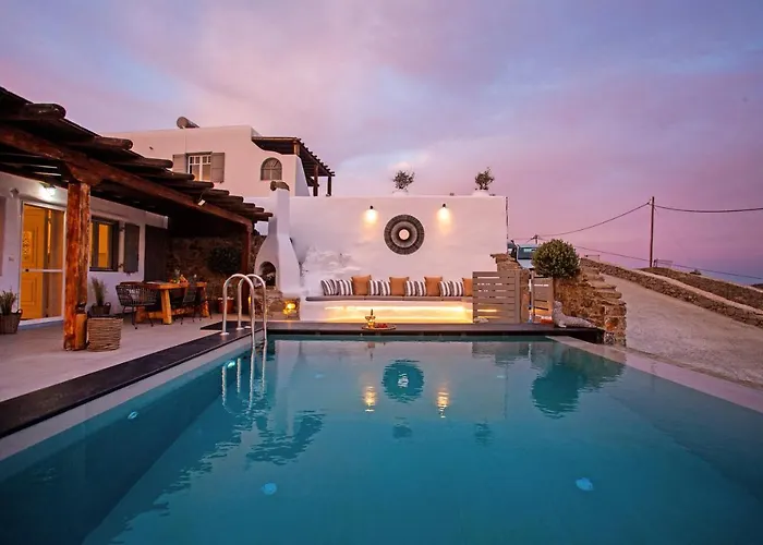 Αυτή η βίλα διαθέτει πλήρως εξοπλισμένη κουζίνα, καθώς και έχει τραπεζαρία για αυτοεξυπηρέτηση. Στην κουζίνα επίσης υπάρχουν ηλεκτρικός βραστήρας, φούρνος και μαγειρικά σκεύη. Οι επισκέπτες μπορούν να γευματίσουν στο Solymar, που είναι σε απόσταση 19 λεπτών με τα πόδια. Το πλησιέστερο αεροδρόμιο είναι Κρατικός Μυκόνου, που βρίσκεται σε απόσταση 5 χλμ. από αυτό το κατάλυμα. Οι παροχές περιποίησης στις εγκαταστάσεις περιλαμβάνουν τζακούζι.